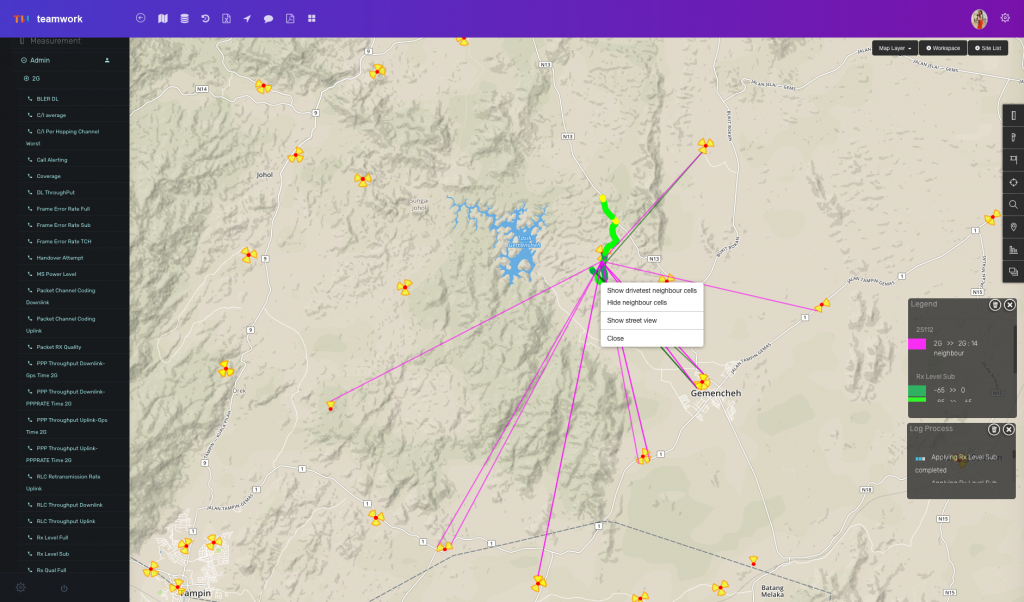 TeamWork designed to allow telecom engineers doing their daily work activity such as reviewing their network configuration on map, analysing their drive test files, make neighbours analysis and many more.. User may create as many as group and share the group access with other members, thus they will share their work activity between team members. This will make their collaboration to analyse network faster.